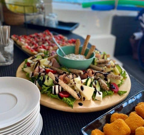 lunch on board (green salad “BIO”, Greek salad, pasta with traditional shrimp saganaki with feta, traditional mussels in turmeric sauce and ouzo, chicken breast, chicken nuggets or pasta for children, fruits & homemade sweets, water, coffee, tea, soft drinks, white Cretan wine, beer, raki (Greek vodka) / during the season, menu might change without prior notice)