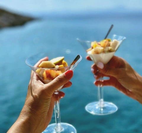 While staying in Dia Island bay, swim on an inflatable flamingo or go exploring the island on SUP board. Or take photos with crystal clear azure waters background. .Menu is prepared with local organic products.